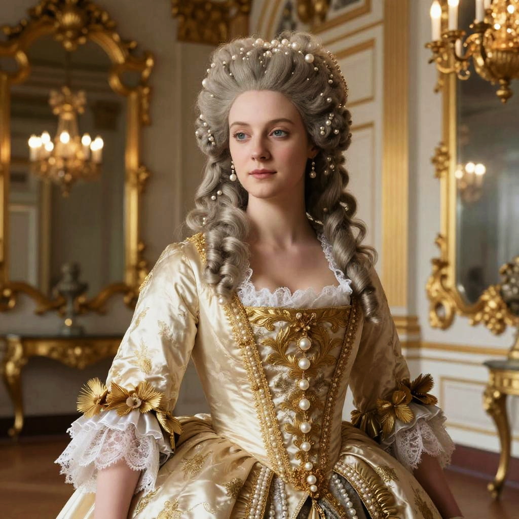 A woman dressed in an elaborate 18th-century aristocratic gown stands gracefully in a richly decorated room with golden accents and ornate mirrors. Her voluminous powdered wig adorned with pearls and the intricate lace and embroidery on her dress exemplify the elegance and opulence of the Rococo style.