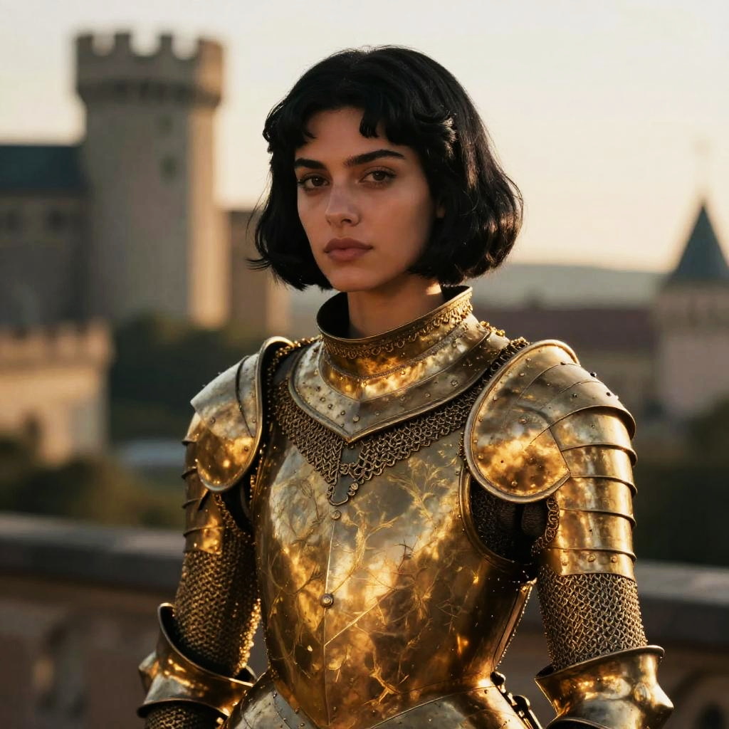 A confident woman dressed in intricately detailed golden medieval armor stands outdoors with a blurred castle tower in the background. The image captures a blend of historical and fantasy styles, highlighting strength and elegance in a contemporary portrait style.