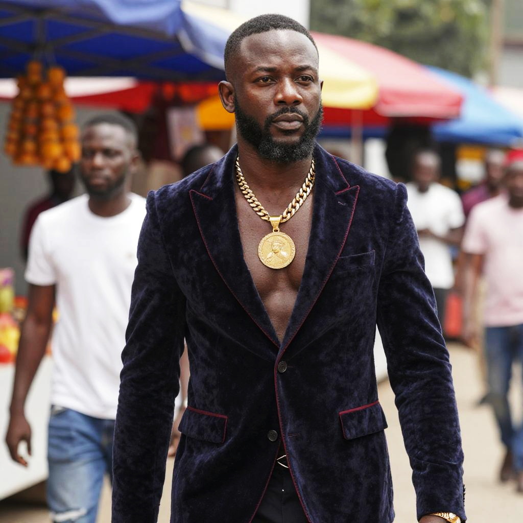 A confident man walks through a bustling street market, wearing a deep navy velvet blazer with no shirt underneath, accentuated by a large gold medallion necklace. The vibrant background features colorful market stalls and people, highlighting a contemporary urban fashion style with bold and luxurious elements.