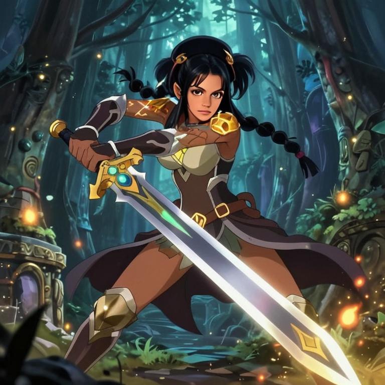 Fantasy Woman Warrior with Glowing Sword in Enchanted Forest Anime Style