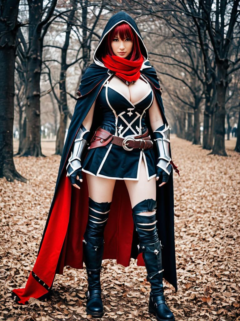 A striking woman dressed as an Assassin Cross from Ragnarok Online stands confidently in a leaf-covered forest path, wearing a detailed cosplay outfit featuring a black and red hooded cape, armored gauntlets, and thigh-high black boots. The photo showcases a blend of realism with fantasy elements, capturing the essence of the character with vivid colors and intricate costume design.