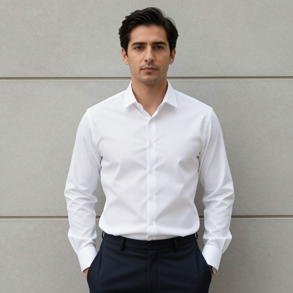 A confident man stands against a light gray tiled wall, wearing a crisp white dress shirt tucked into dark pants. The minimalist background and his formal attire emphasize a professional and polished appearance.