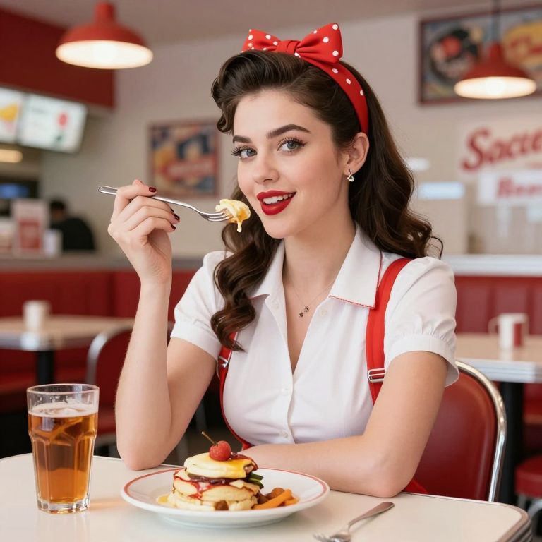 A smiling young woman dressed in a retro 1950s-style outfit with a red polka-dot headband enjoys pancakes with syrup and fruit toppings at a vintage diner. The cozy setting features classic diner decor, complementing her nostalgic look and bright red lipstick. A glass of iced tea sits nearby, adding to the wholesome dining experience.
