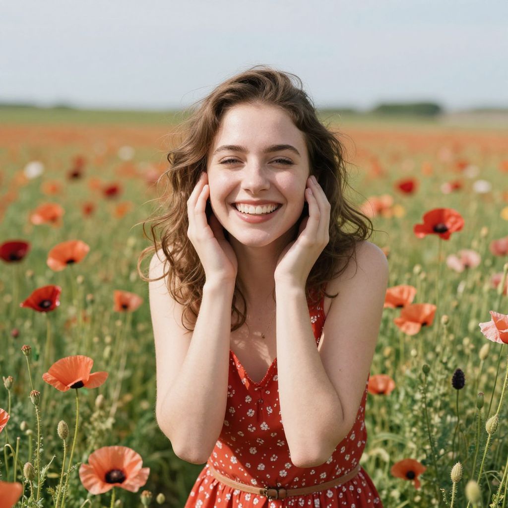 A cheerful young woman in a red floral dress stands in the middle of a vibrant poppy field, smiling broadly with her hands gently touching her face. The natural sunlight enhances the warm and joyful atmosphere of this outdoor portrait captured in a natural setting.