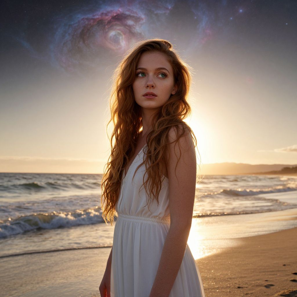 A young woman with long red hair wearing a white dress stands contemplatively on a beach during sunset, with gentle waves rolling in behind her. The warm backlight creates a soft glow around her silhouette, and a surreal galaxy is visible in the sky, adding a dreamy, ethereal atmosphere to the scene.