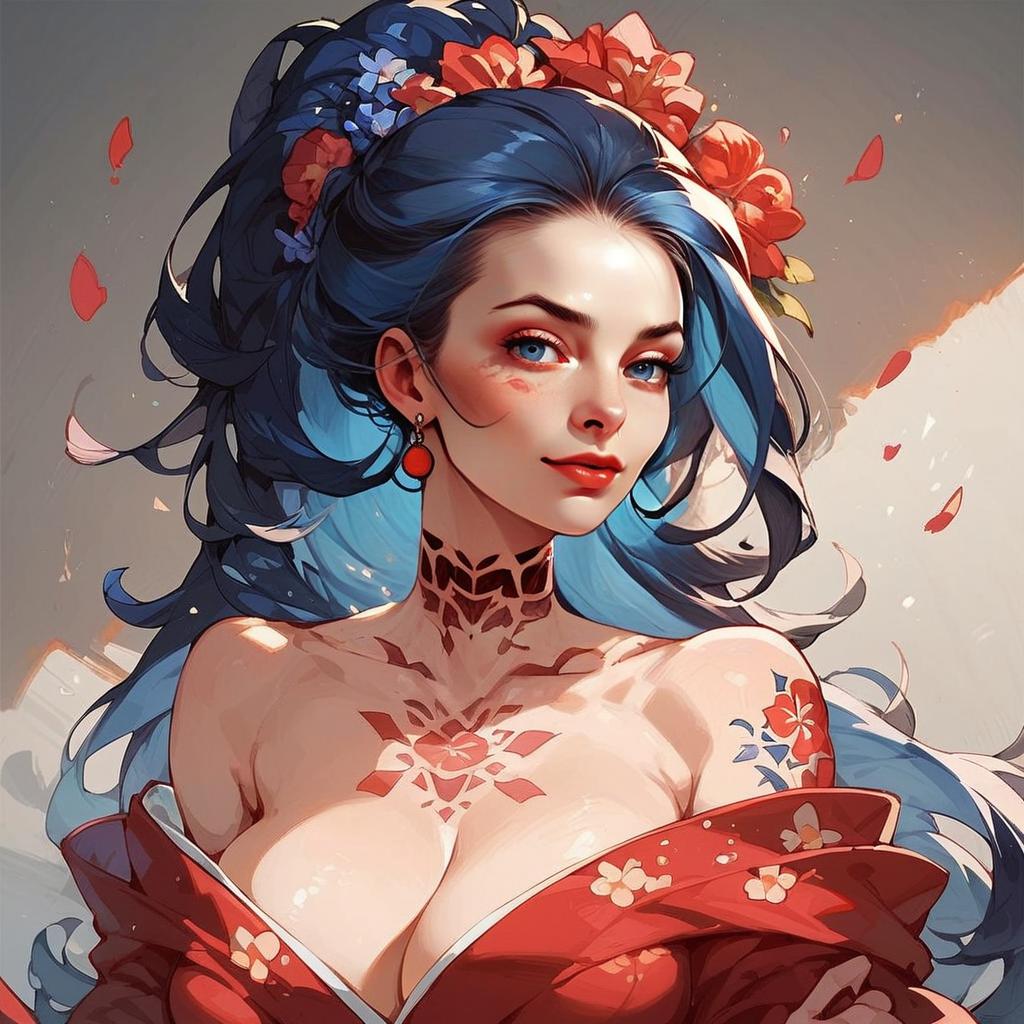 This digital illustration features a woman with striking blue hair adorned with red and blue flowers, styled in an elegant updo. She wears a detailed red kimono with floral patterns, complemented by intricate tattoos on her neck and shoulder, showcasing a sophisticated anime and fantasy art style.