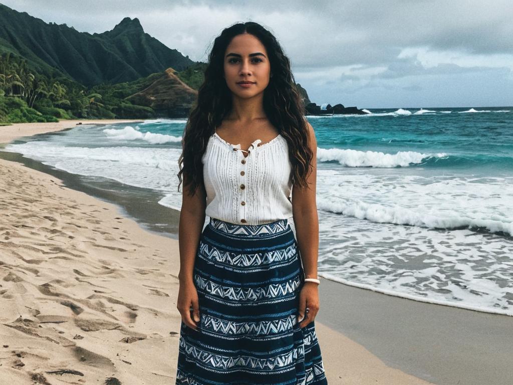 A woman stands confidently on a tropical beach with lush green mountains and crashing waves in the background. She wears a white sleeveless top paired with a blue patterned skirt, evoking a relaxed and natural island vibe reminiscent of Moana's Polynesian style. The overcast sky adds a serene and moody atmosphere to the coastal scene.