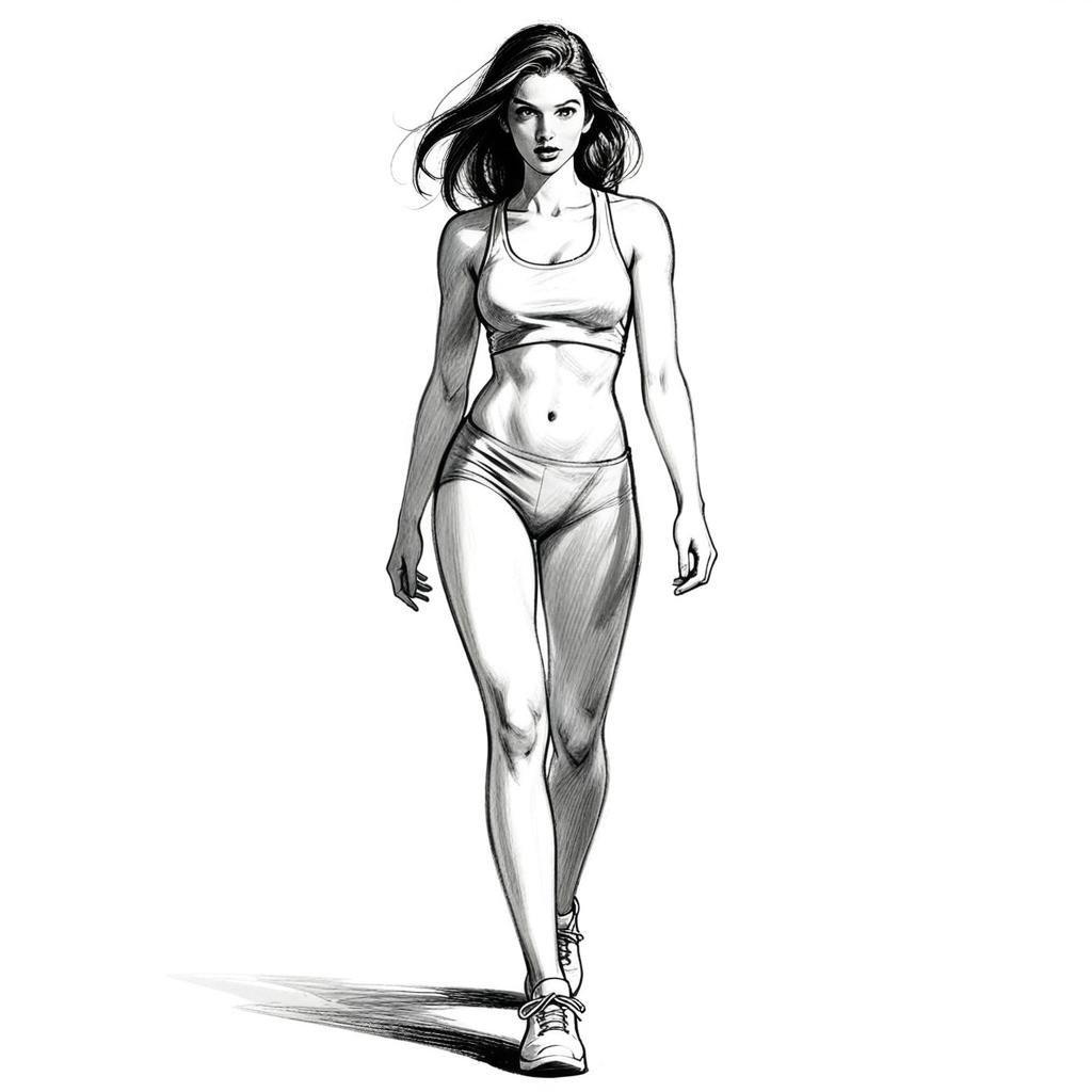 A detailed pencil sketch of a confident young woman walking forward in athletic wear, consisting of a sports bra and shorts. The monochrome drawing emphasizes realistic shading and anatomy, highlighting the style and poise of the figure in a classic illustrative manner.