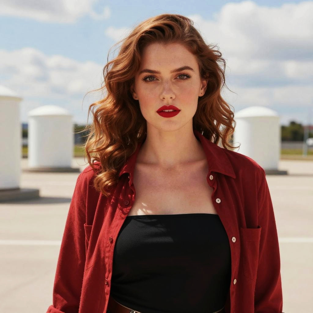 A confident woman with wavy red hair stands outdoors against a soft-focused urban backdrop under a partly cloudy sky. She wears a black strapless top paired with a red button-up shirt, complemented by bold red lipstick, creating a striking and fashionable look.