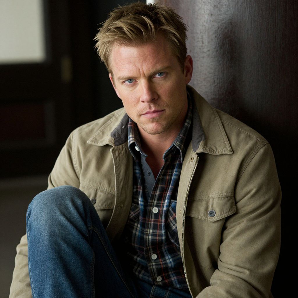 A man with light brown hair and blue eyes sits contemplatively against a dark wooden wall. He is dressed casually in a beige jacket over a plaid shirt and blue jeans, conveying a relaxed yet thoughtful mood.