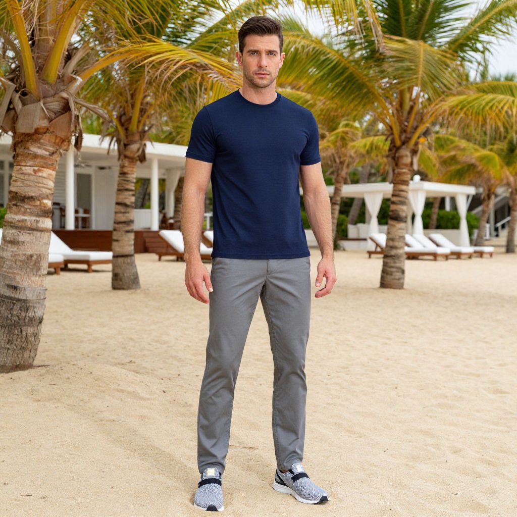 A man stands confidently on a sandy beach lined with palm trees, wearing a navy blue t-shirt, gray pants, and sneakers. The background features a stylish beach resort with white lounge chairs and cabanas, creating a relaxed, tropical atmosphere.