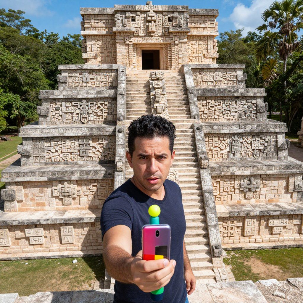 A man takes a selfie in front of a detailed ancient stone pyramid adorned with intricate carvings, set against a backdrop of lush greenery and blue skies. The image captures the blend of modern technology with historical architecture in a vibrant outdoor setting.