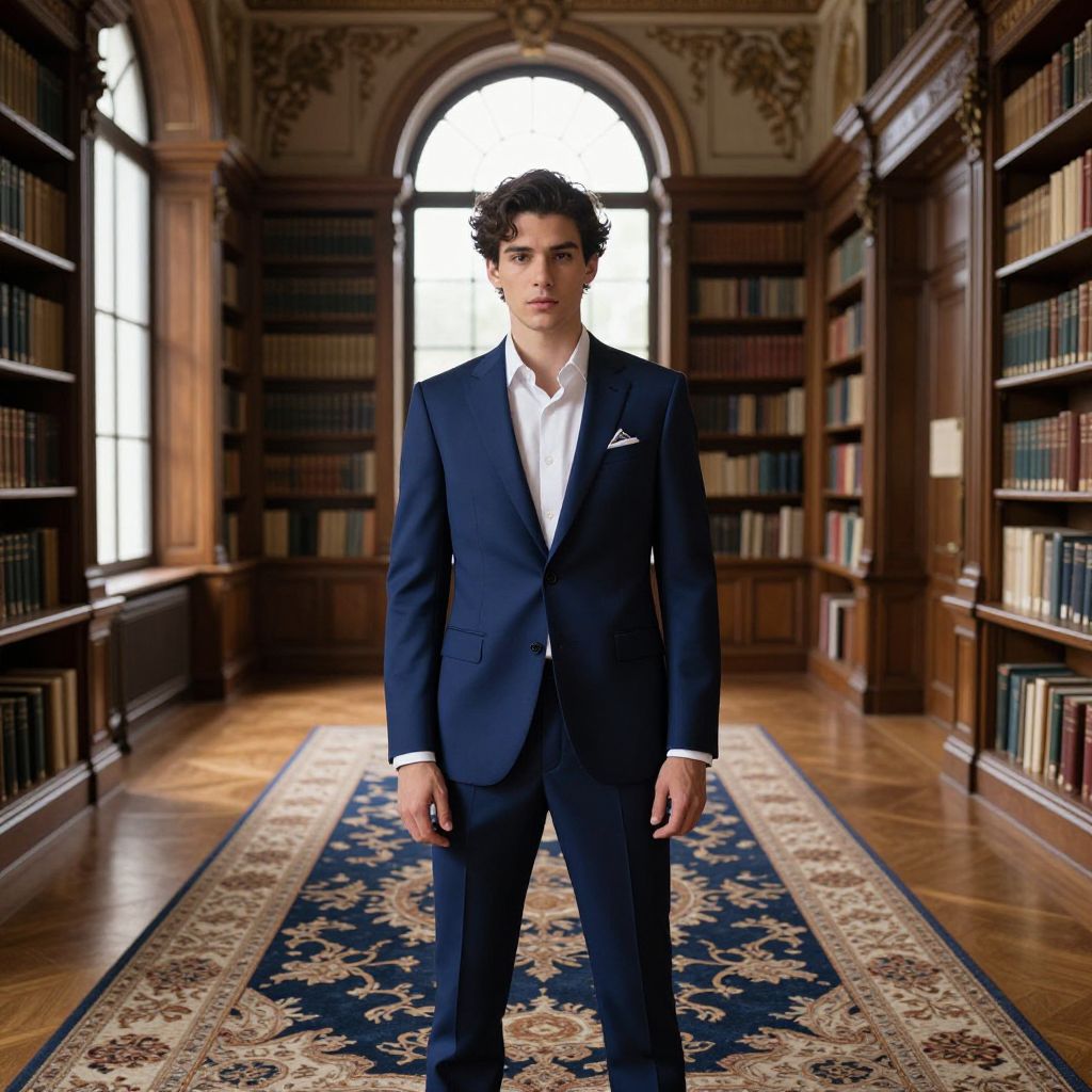 A young man stands confidently in an elegant library room filled with wooden bookshelves and an ornate carpet. He is dressed in a sharp navy blue suit with a white dress shirt and pocket square, embodying a classic, sophisticated style.