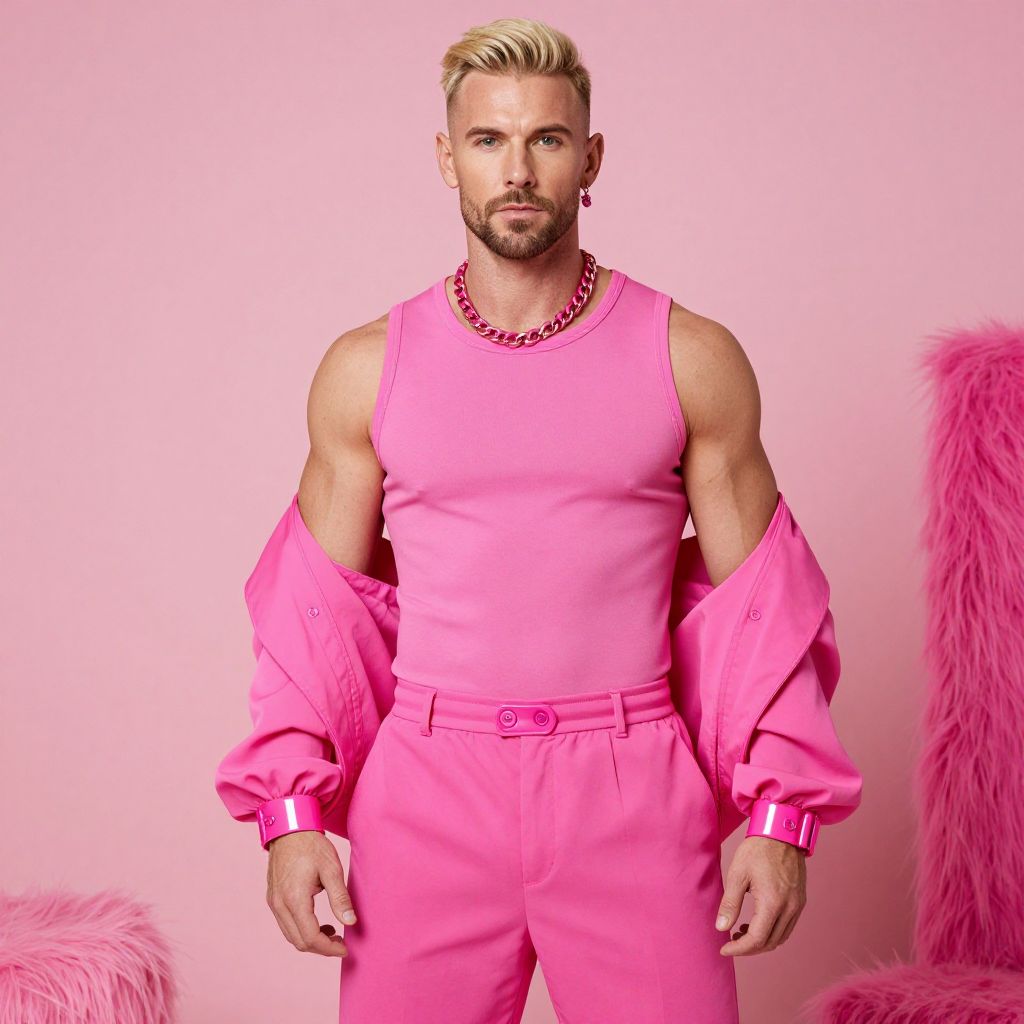 A stylish man stands confidently against a pink background, dressed entirely in vibrant pink clothing including a sleeveless top, matching pants, and a jacket draped over his shoulders. His platinum blonde hair and pink accessories such as a chunky chain necklace and earrings enhance the modern and bold monochromatic fashion look.