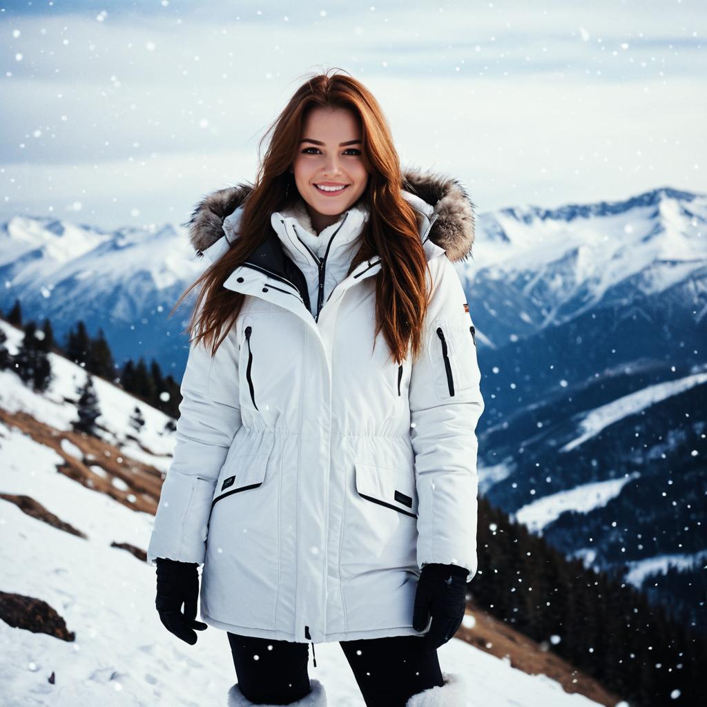 A young woman stands outdoors in a snowy mountain landscape, dressed warmly in a white winter jacket with a fur-lined hood and black gloves. The background showcases snow-covered peaks and a cloudy sky with gentle snowfall, creating a serene and picturesque winter scene.