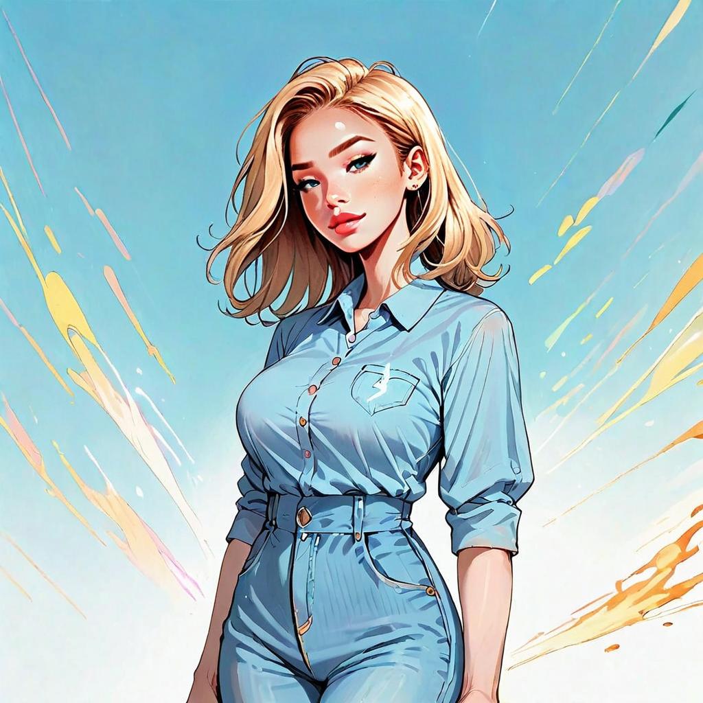 This digital artwork features a confident blonde woman dressed in a stylish high-waisted denim outfit, set against a vibrant sky background with dynamic, colorful streaks. The illustration blends modern fashion with a semi-realistic anime style, emphasizing clean lines and smooth shading to create a striking visual impact.