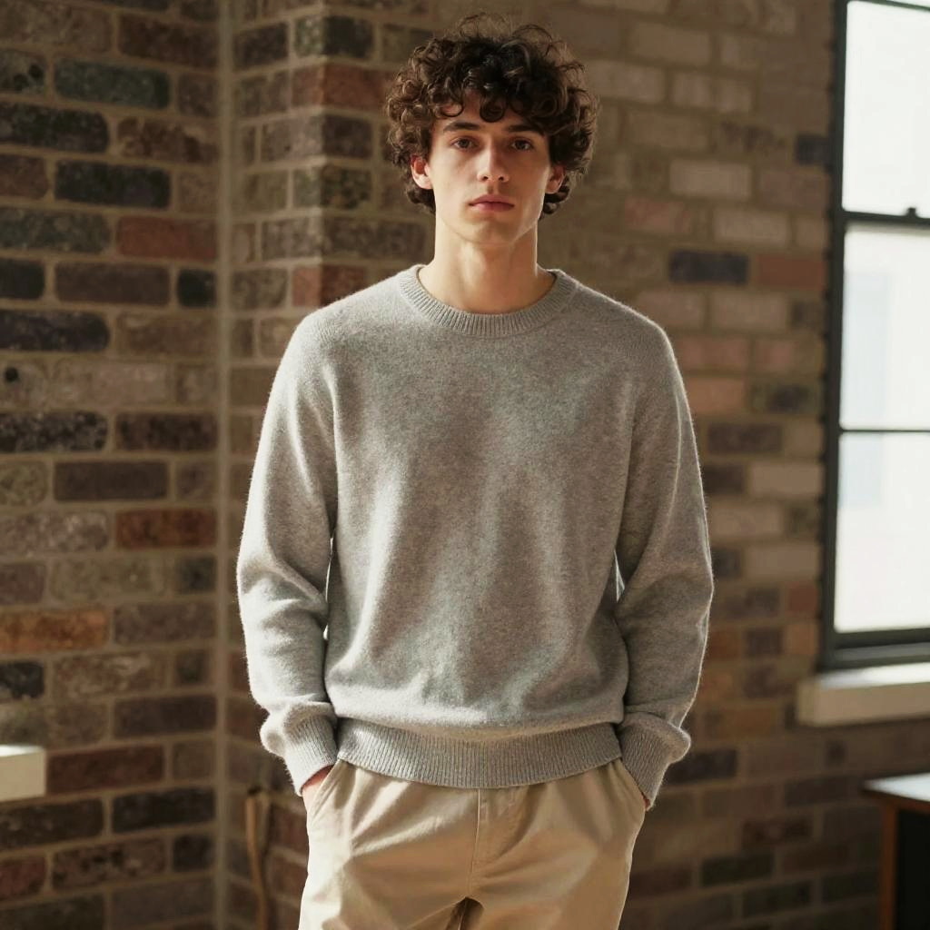 A young man with curly hair stands confidently in a casual indoor setting, wearing a light grey sweater and beige pants. The background features a rustic brick wall and large windows, adding a cozy, urban vibe to the portrait.