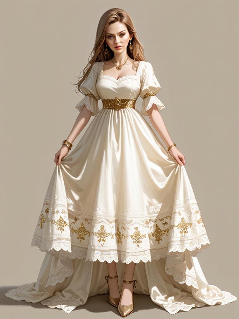 A woman stands gracefully wearing a flowing bohemian chic white dress adorned with intricate gold embroidery along the hem. The dress features puffed sleeves, a fitted bodice, and a wide gold belt that accentuates the waist, creating an elegant full-body look with a vintage-inspired aesthetic.