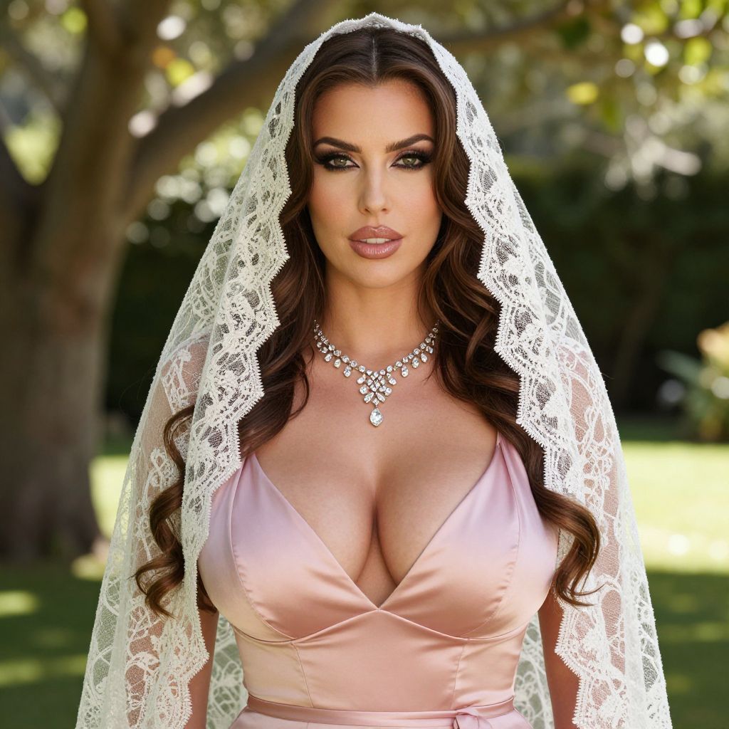 A glamorous woman stands outdoors wearing a delicate lace veil over her long, wavy hair and a satin blush pink dress with a plunging neckline. She accessorizes with a sparkling diamond necklace, and the soft natural light highlights her flawless makeup and elegant features against a lush garden background.