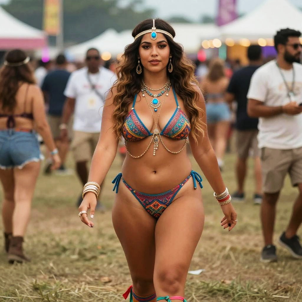 A confident young woman walks through an outdoor festival wearing a colorful patterned bikini and ornate bohemian-style jewelry. Her long wavy hair is adorned with a turquoise headpiece, perfectly complementing her vibrant festival look. The background shows other attendees, capturing the lively and relaxed atmosphere of the event.