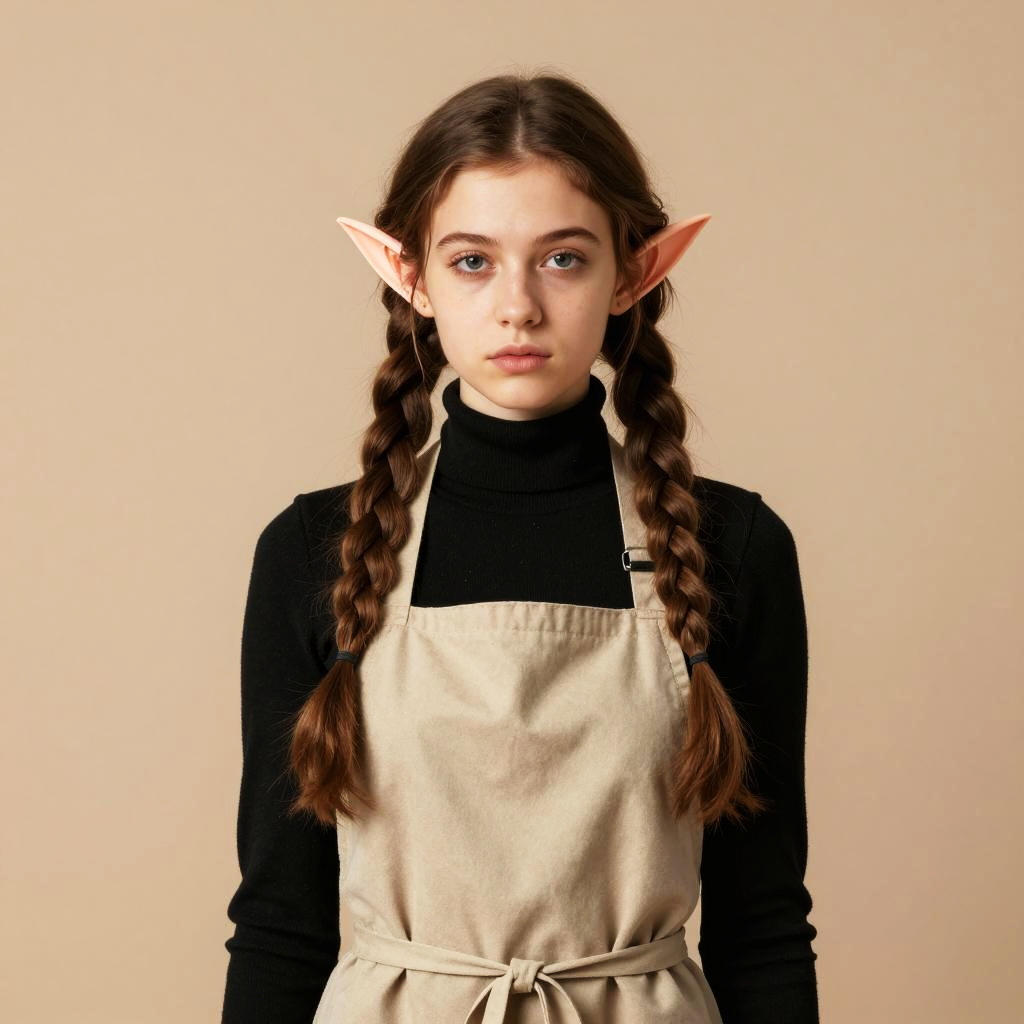 A young woman with long braided hair dressed in a black turtleneck and beige apron stands against a neutral background, wearing elf-like pointed ears as a whimsical accessory. The minimalistic studio portrait highlights a blend of modern fashion with fantasy elements, creating a unique and intriguing visual style.