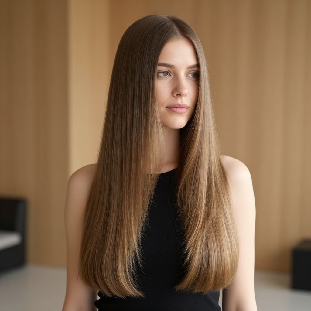 A young woman with long, straight, light brown hair is seen wearing a sleeveless black top, standing against a neutral beige background. Her serene expression and smooth hair texture highlight a natural, minimalist style in a softly lit indoor setting.