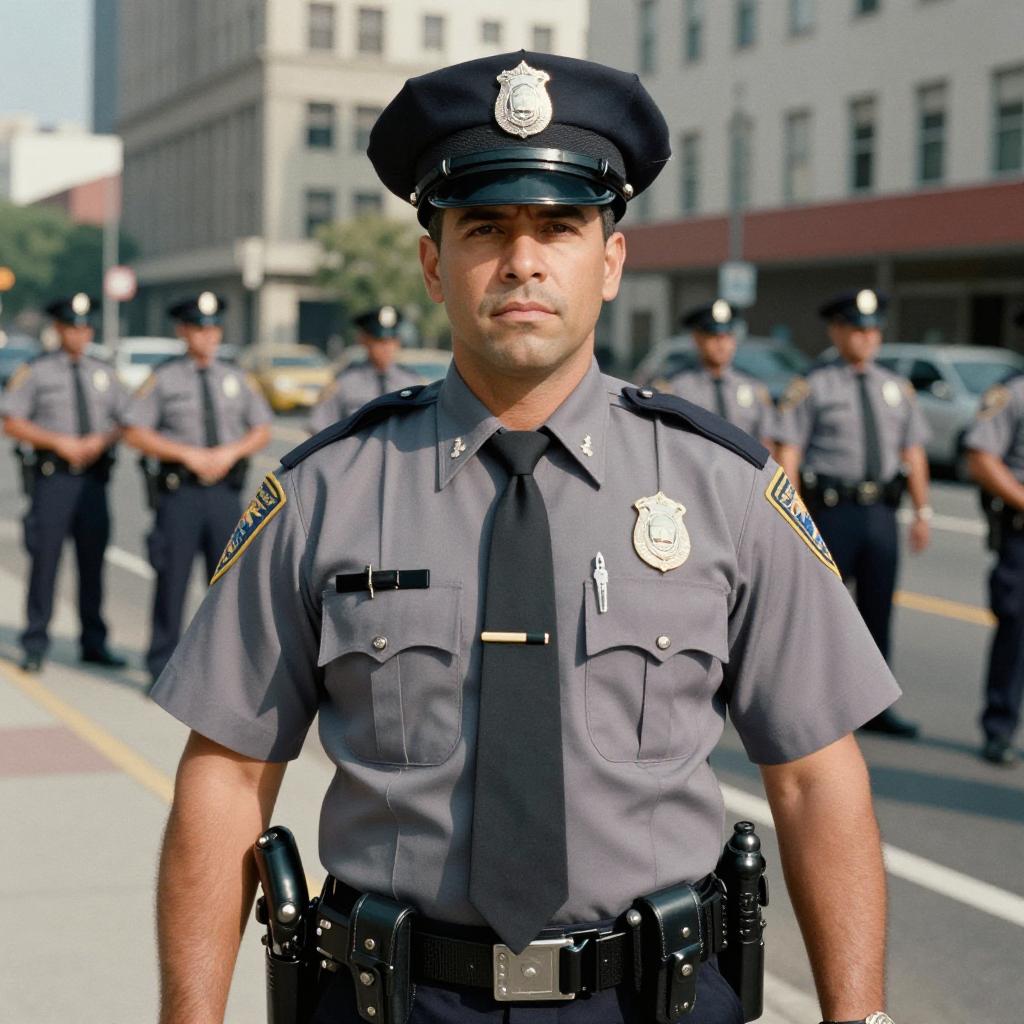 A serious male police officer stands prominently in the foreground, wearing a classic gray uniform with black tie and a peaked cap, with a line of similarly dressed officers standing in formation behind him on a city street. The image captures the disciplined and authoritative presence of law enforcement in an urban environment.