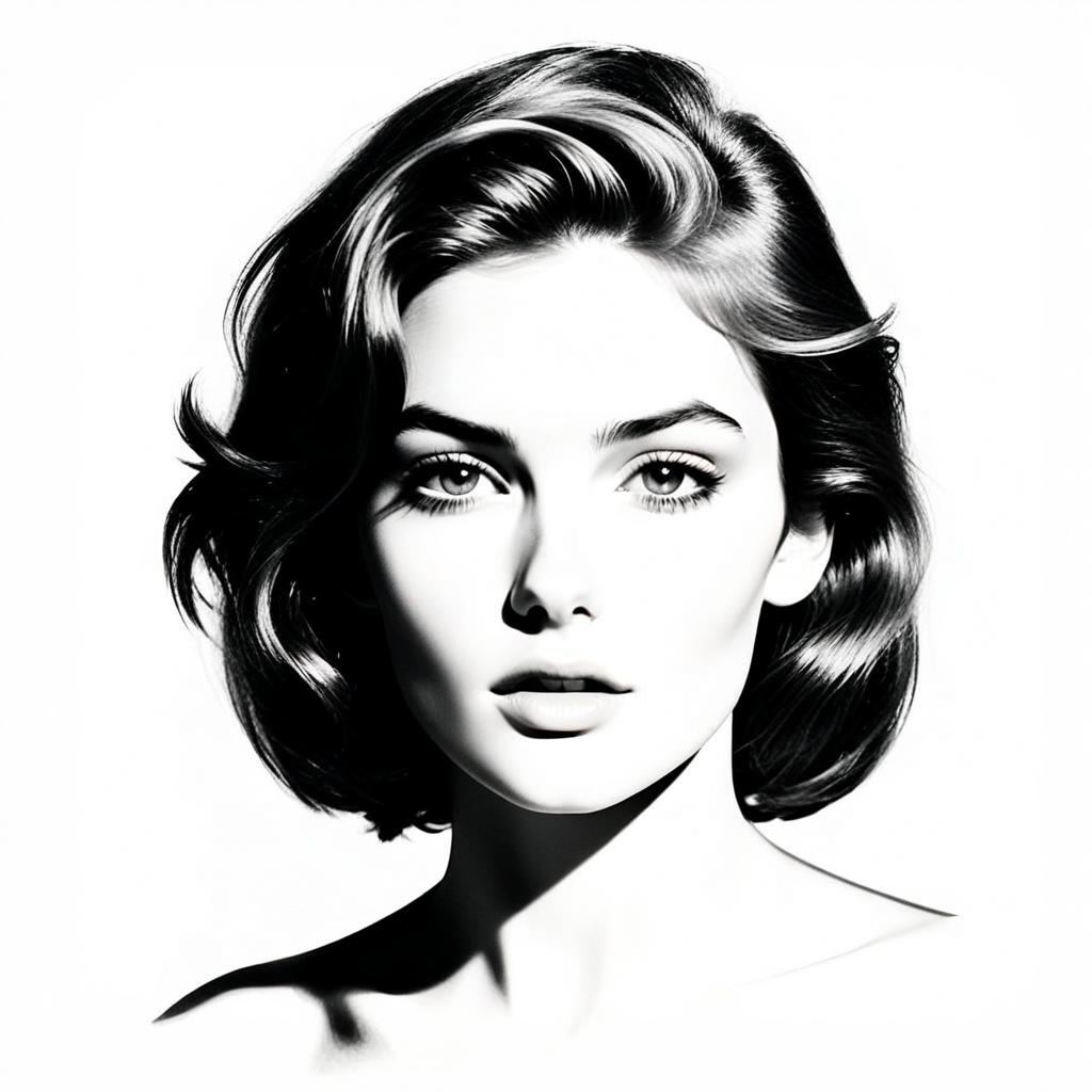A striking black and white portrait of a young woman with soft, wavy hair styled in a classic, vintage-inspired look. The high-contrast lighting and smooth skin texture highlight her symmetrical features, evoking a timeless elegance with a modern photographic style.