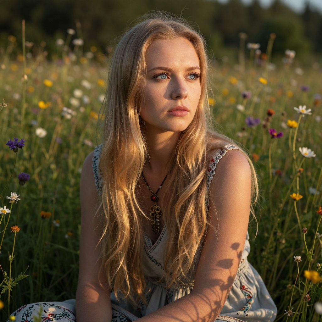 A young woman with long blonde hair sits thoughtfully in a sunlit meadow filled with wildflowers. The warm golden hour light highlights her serene expression and delicate features, creating a peaceful and natural atmosphere.