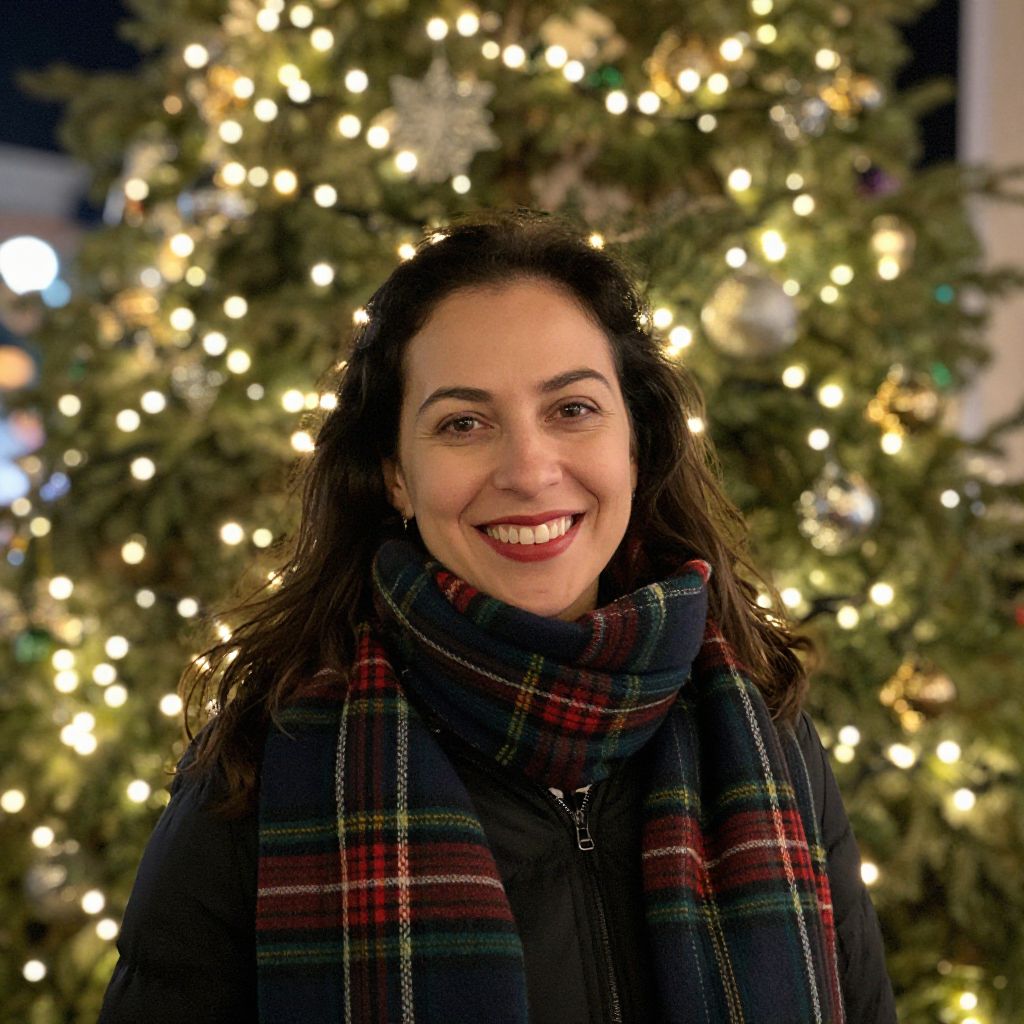Smiling Woman with Plaid Scarf in Front of Christmas Tree Lights