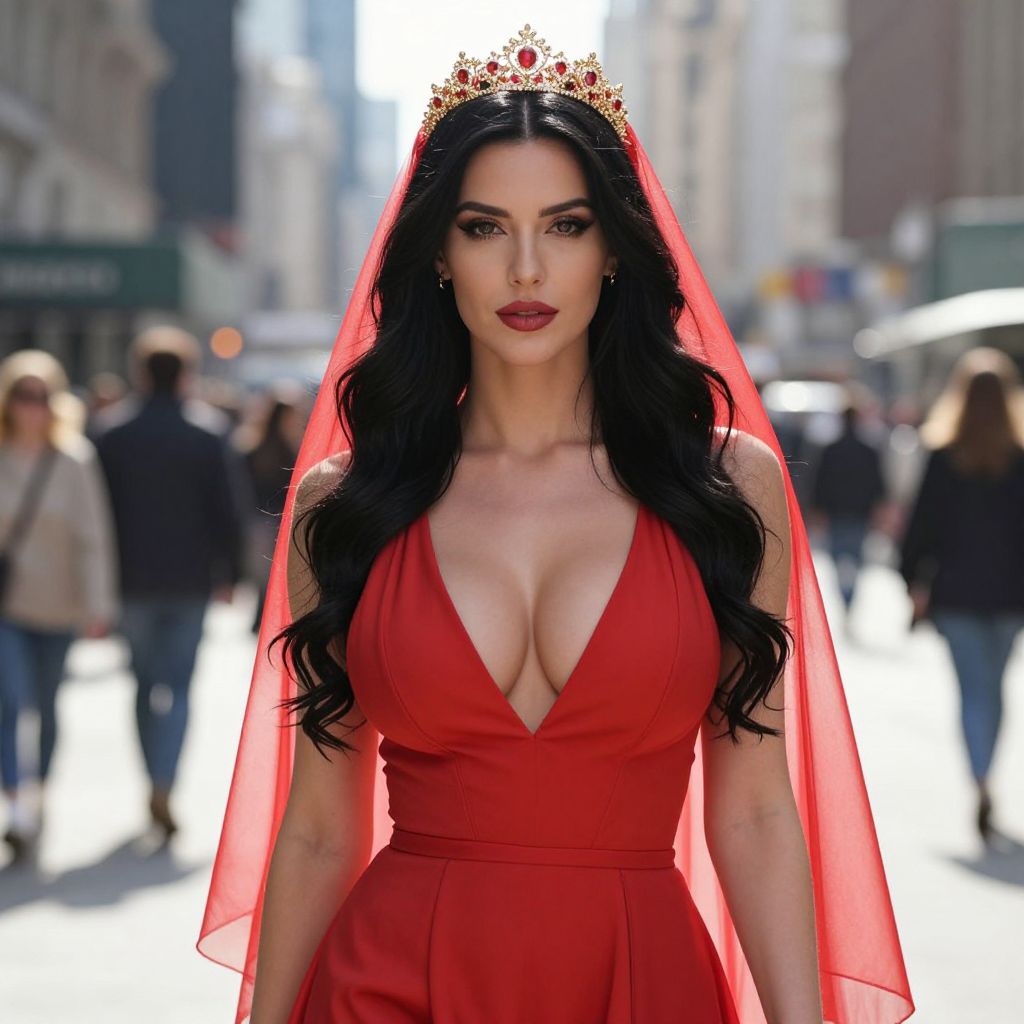 A confident woman with long, dark hair stands in a city street wearing a striking red dress with a deep neckline and a matching red veil. She is adorned with a golden crown featuring red jewels, giving her a regal and elegant appearance against an urban blurred background.
