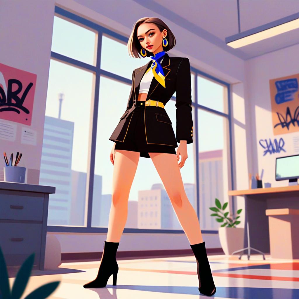 This vibrant digital illustration features a confident young woman in a modern office setting, dressed in a sleek black blazer and shorts combo paired with a stylish blue and yellow scarf. The artwork showcases a bold, contemporary style with clean lines and dynamic lighting that emphasize her poised stance and trendy fashion.