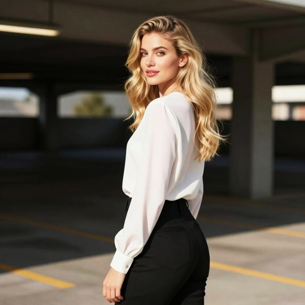 A confident young woman with long blonde wavy hair poses in a modern urban setting, wearing a sophisticated white blouse and fitted black pants. The image showcases a stylish Gen Z fashion aesthetic with natural lighting highlighting her poised expression and casual elegance.