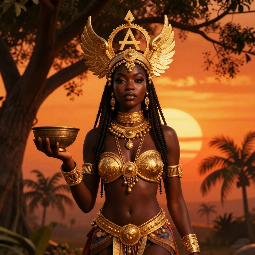A striking woman dressed in elaborate golden armor and jewelry stands confidently against a vivid sunset backdrop with palm trees. Her intricate headdress with winged motifs and the golden bowl she holds evoke a regal, almost mythical presence reminiscent of ancient African or fantasy-inspired royalty.