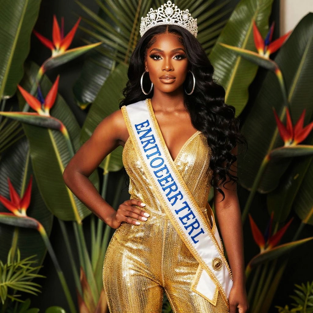 A poised woman wearing a sparkling gold jumpsuit and a crown poses confidently against a backdrop of tropical plants and vibrant bird-of-paradise flowers. She wears a sash with partially visible text and large hoop earrings, embodying elegance and grace in a pageant or ceremonial style portrait.