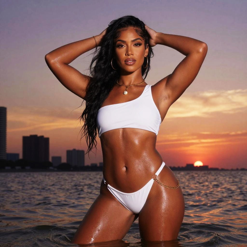 A confident woman poses in a white one-shoulder bikini in the water during sunset, with a city skyline visible in the background. The warm golden hour lighting accentuates her sun-kissed skin and highlights her toned physique.
