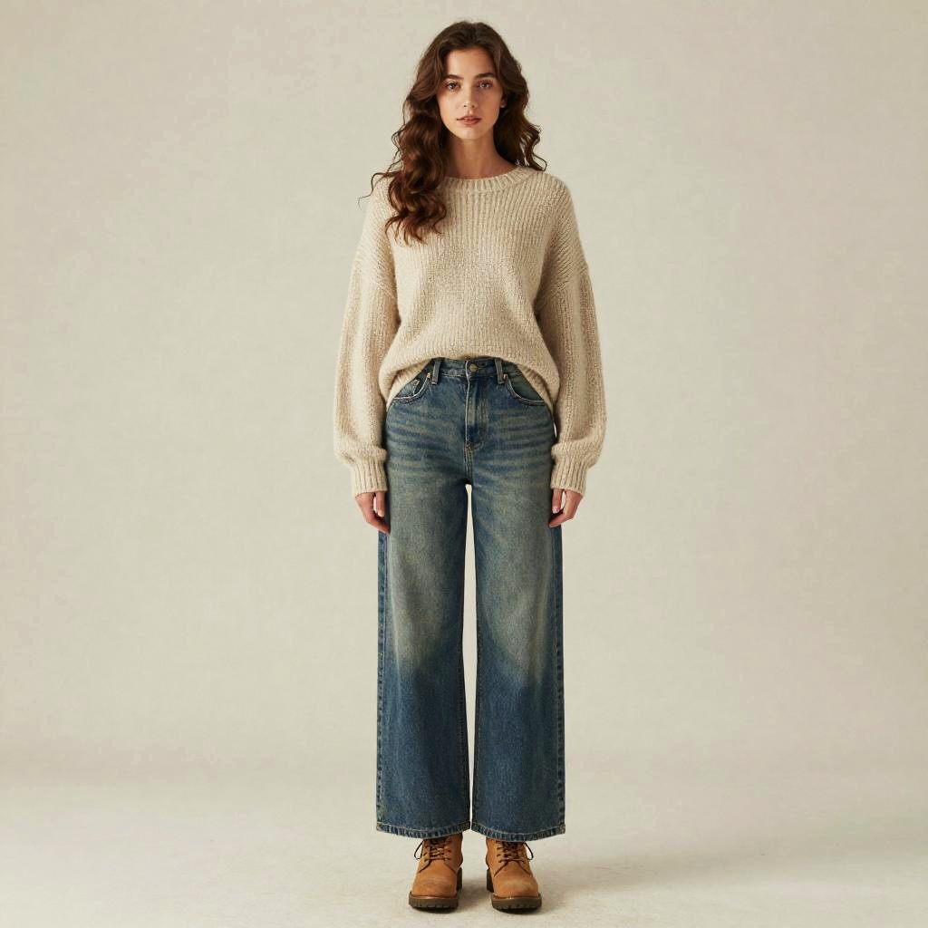 A woman stands confidently against a neutral background wearing a chunky beige knit sweater paired with wide-leg vintage-style blue jeans and tan lace-up boots. The outfit showcases a casual yet stylish look that blends cozy textures with classic denim for a modern Gen Z-inspired fashion statement.