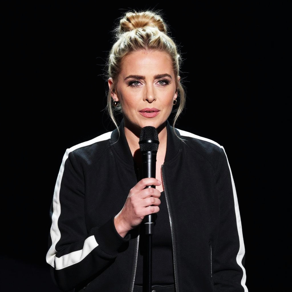 A confident woman with blonde hair tied in a bun stands on stage holding a microphone, ready to perform or speak. She is wearing a black jacket with white stripes on the sleeves, and the background is completely dark, focusing attention on her face and expression.