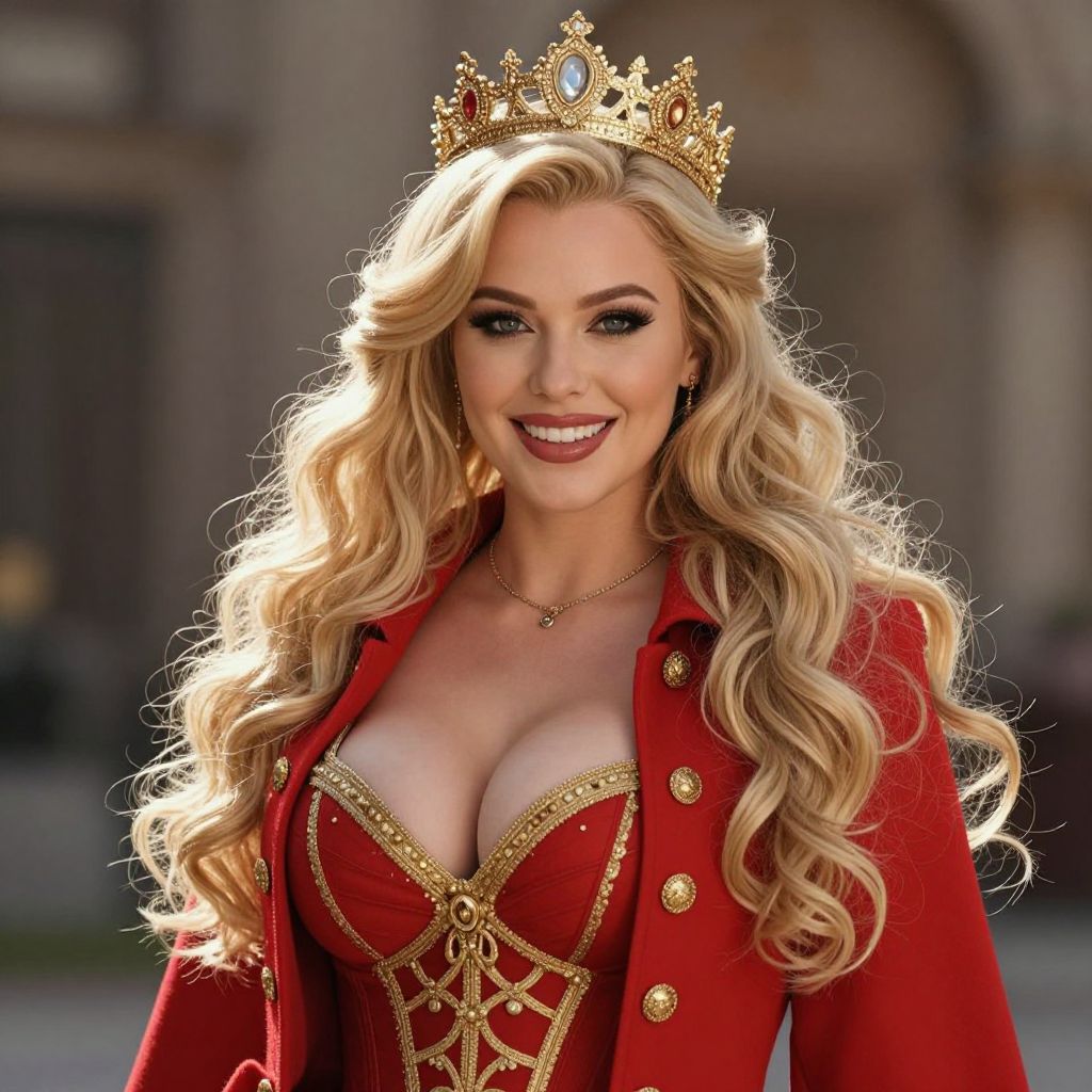 A confident blonde woman wearing a luxurious golden crown and an elegant red and gold corset-style top paired with a matching red jacket adorned with gold buttons. Her long, wavy hair and radiant smile emphasize a regal, royal-inspired fashion style in an outdoor setting.
