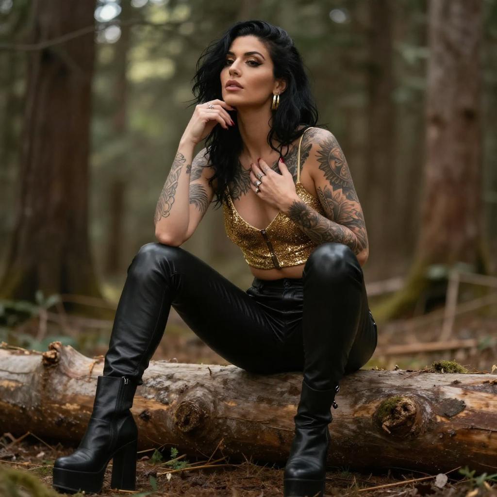 A confident young woman with dark hair and full-sleeve tattoos poses stylishly on a fallen log in a serene forest setting. She wears a sparkling gold crop top paired with black leather pants and high-heeled boots, capturing a bold, edgy Gen Z fashion vibe.
