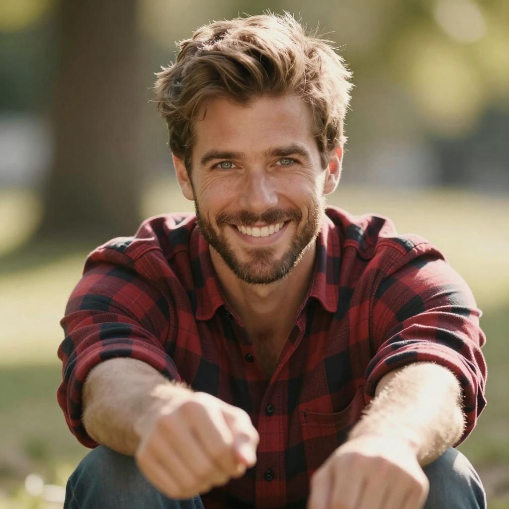 A young man with a beard and tousled hair smiles warmly at the camera while sitting outdoors in a natural setting. He is wearing a red and black checkered flannel shirt, radiating a relaxed and joyful vibe in soft, natural lighting.