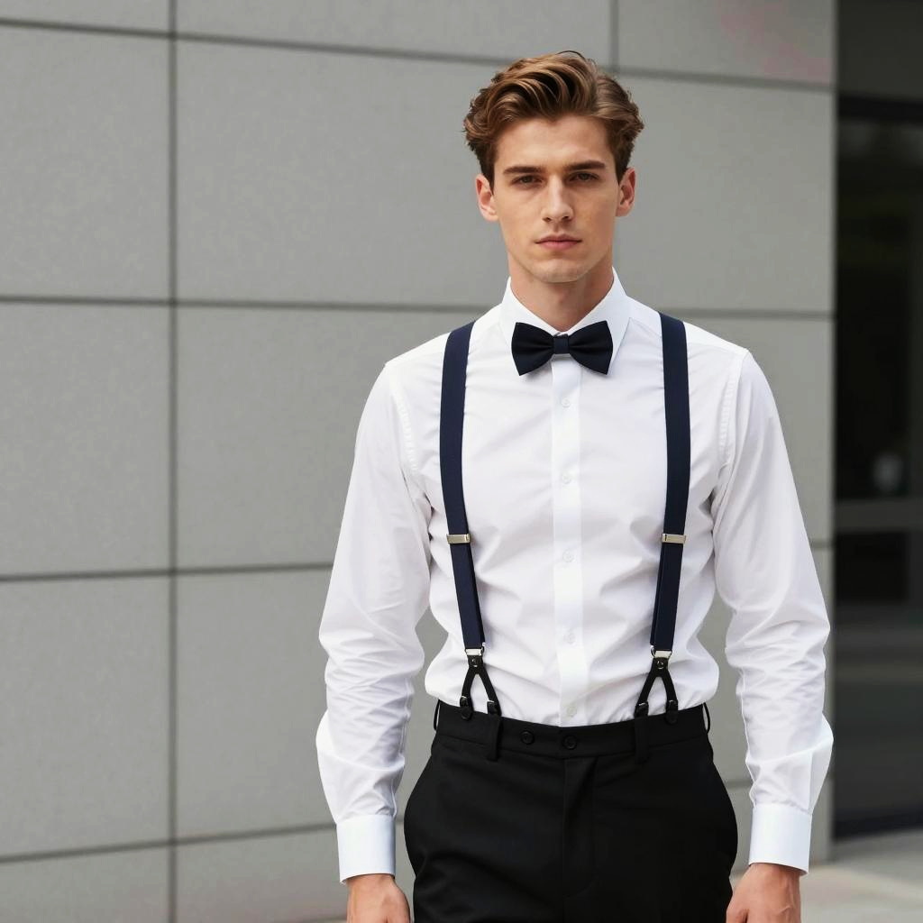 A young man dressed in classic formal attire including a white dress shirt, black bow tie, and dark suspenders stands confidently against a modern tiled wall. The style reflects a timeless, elegant look that blends traditional fashion elements with a contemporary urban setting.