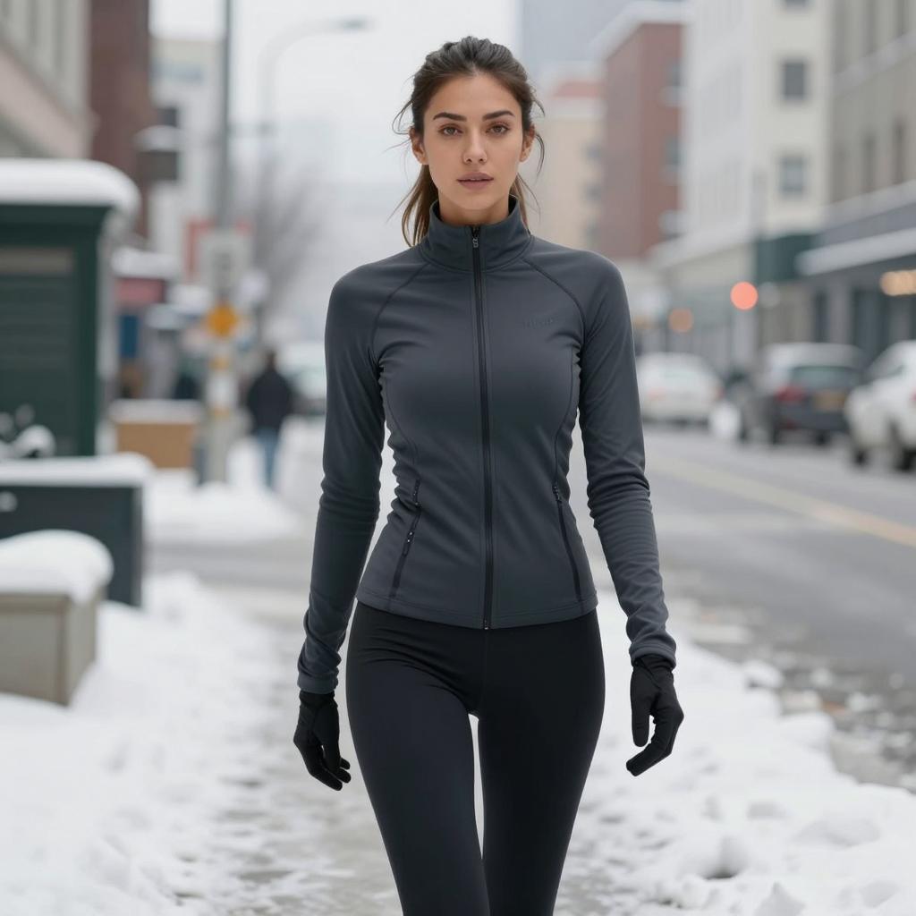 A fit woman dressed in sleek, dark activewear walks confidently on a snowy urban sidewalk, showcasing modern winter athletic apparel. The image captures a focused, determined expression and the practicality of cold-weather workout gear in a city environment.