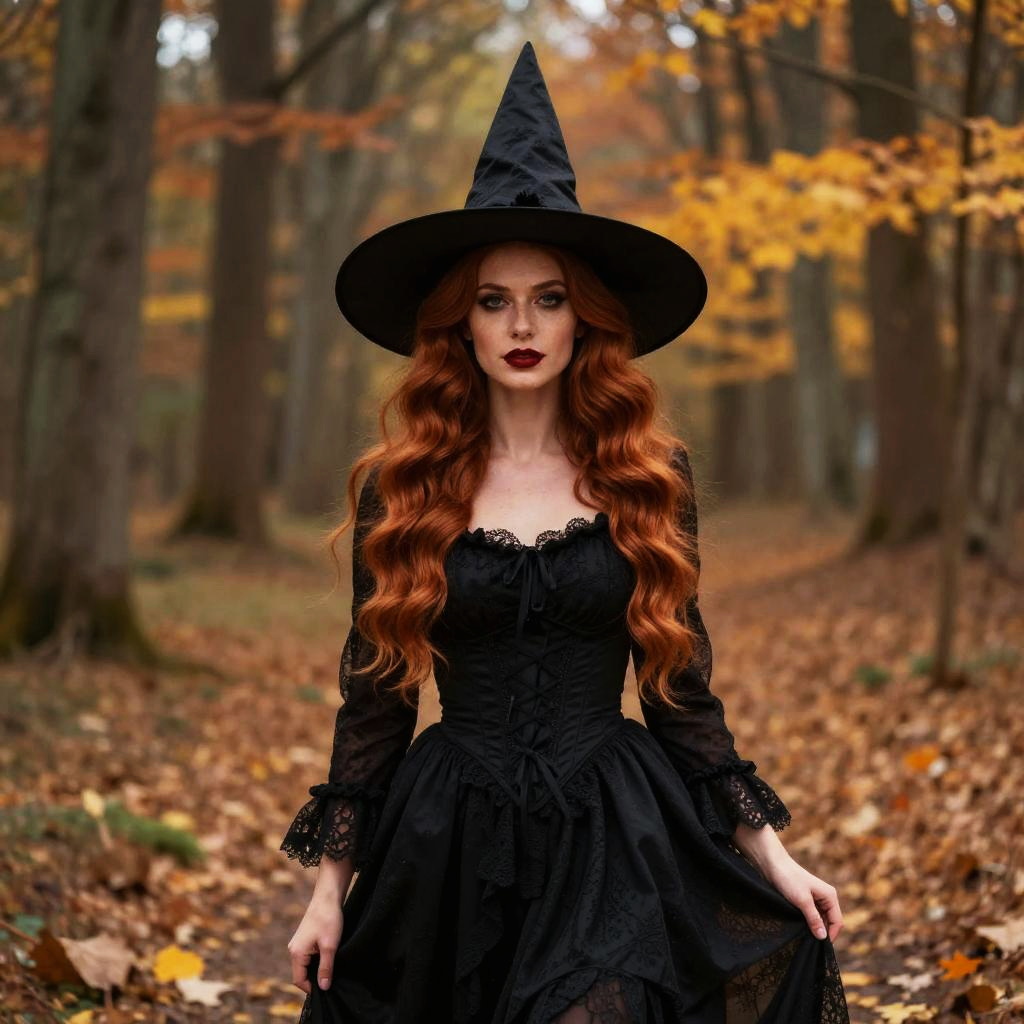 A striking woman with long, wavy red hair dressed in an elegant black witch costume stands in an autumn forest. The outfit features intricate lace details and a classic pointed witch hat, perfectly complementing the fall foliage backdrop.