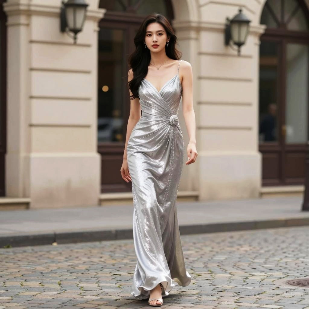 A stylish young woman walks confidently on a cobblestone street wearing a shimmering silver evening gown with a ruched design and delicate straps. The dress, featuring elegant embellishments, embodies modern glamor and sophistication in an urban setting.