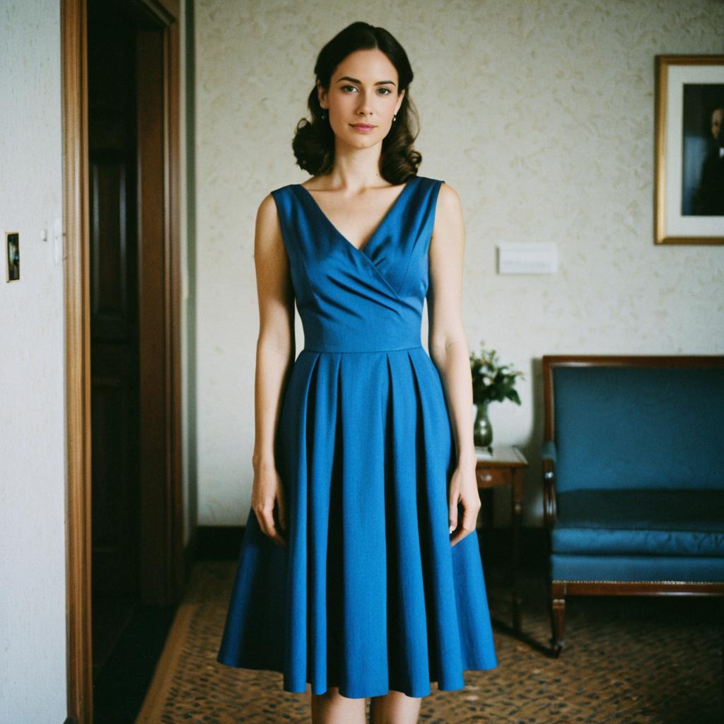 A woman stands gracefully in a vintage-style room wearing an elegant, sleeveless blue dress with a V-neck and a pleated skirt. The setting, featuring classic furniture and subtle floral wallpaper, complements the timeless and sophisticated look of the dress.