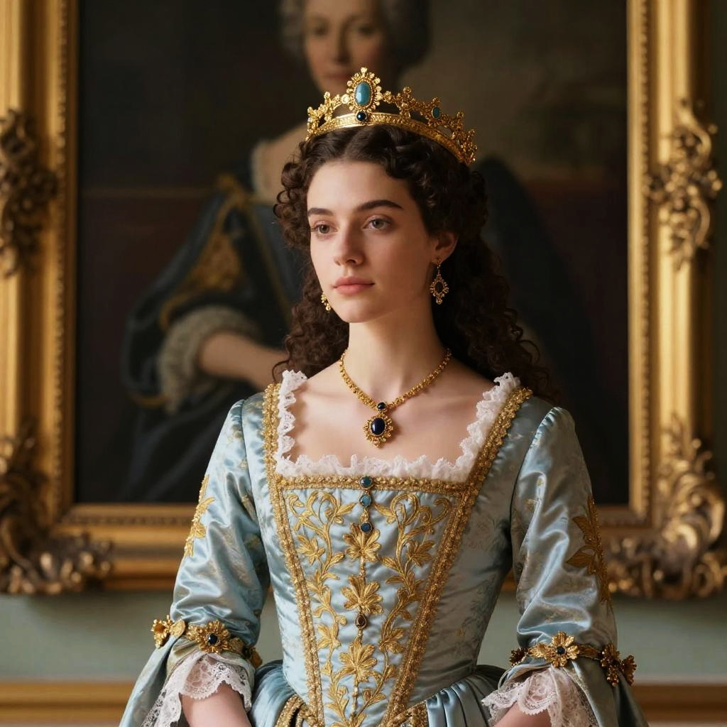 A young woman dressed in an elaborate 18th-century style royal gown adorned with intricate gold embroidery and lace stands poised in front of a classical portrait. She wears a golden crown with turquoise and sapphire jewels, complemented by matching earrings and a necklace, embodying aristocratic elegance and historical fashion.