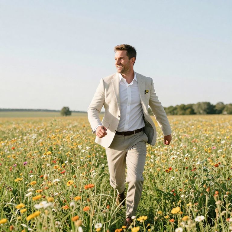 A man dressed in a light beige suit and white shirt walks confidently through a vibrant wildflower field under clear skies. The image captures a joyful and relaxed moment in an open natural setting, emphasizing a blend of professional style and outdoor leisure.