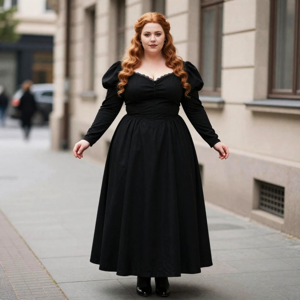 A plus-size woman stands confidently on a city street wearing an elegant black dress inspired by Yennefer's costume from fantasy lore. Her long, wavy red hair contrasts beautifully with the dark, dramatic outfit featuring puffed shoulders and a fitted bodice.