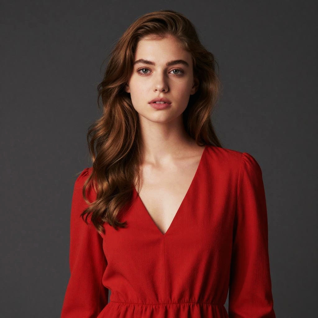 A young woman with long wavy light brown hair and clear blue eyes poses against a dark solid background, wearing a vibrant red V-neck dress. The portrait emphasizes natural beauty and classic elegance with soft lighting and a minimalist composition.